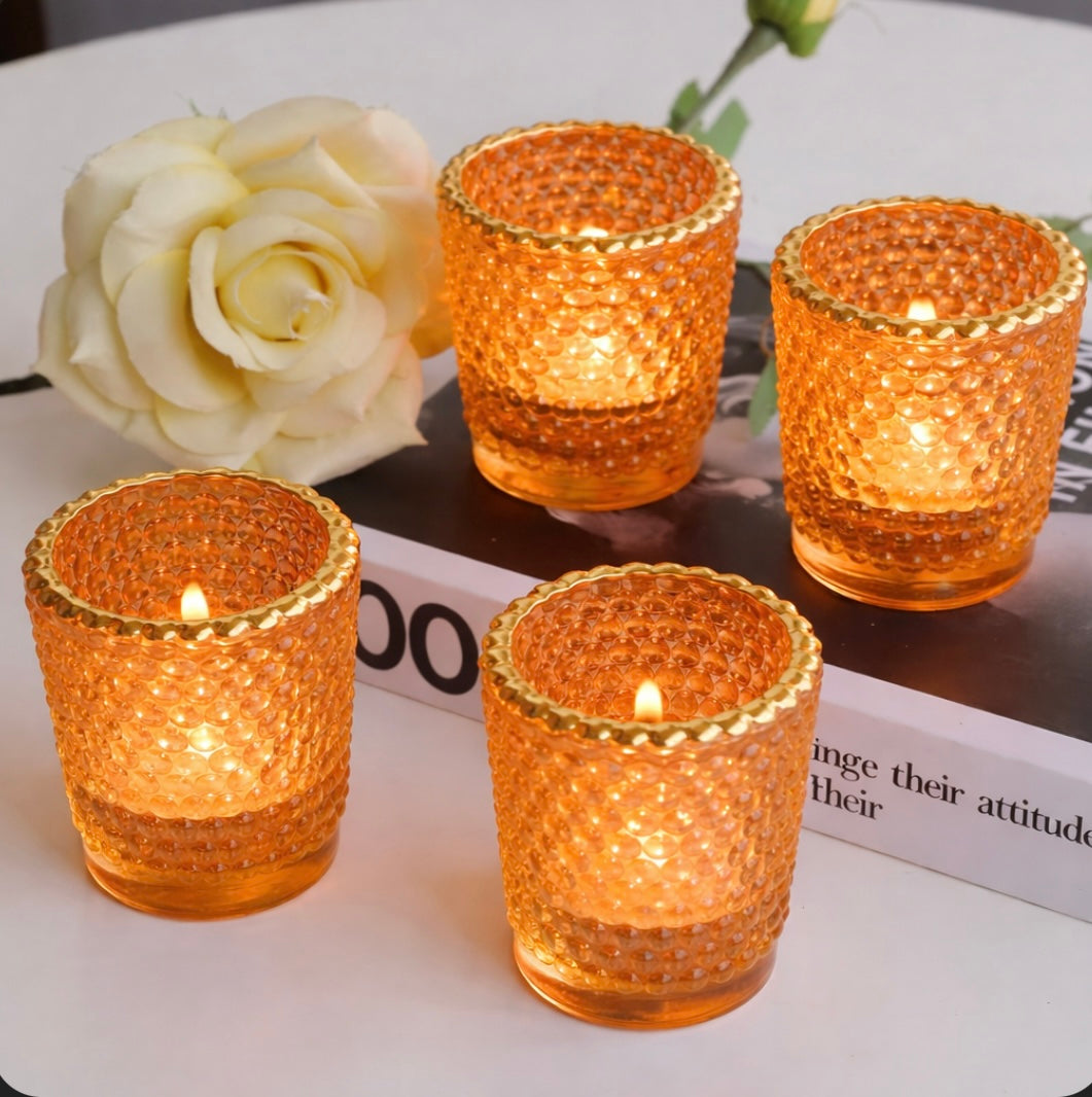Crafted from jewel-toned light orange translucent glass, each holder features a raised hobnail texture that enhances the glow of the flame while adding a vintage-inspired charm to your décor. The gold-trimmed rim adds a refined, upscale touch that looks stunning on tables, mantels, shelves, and centerpieces.