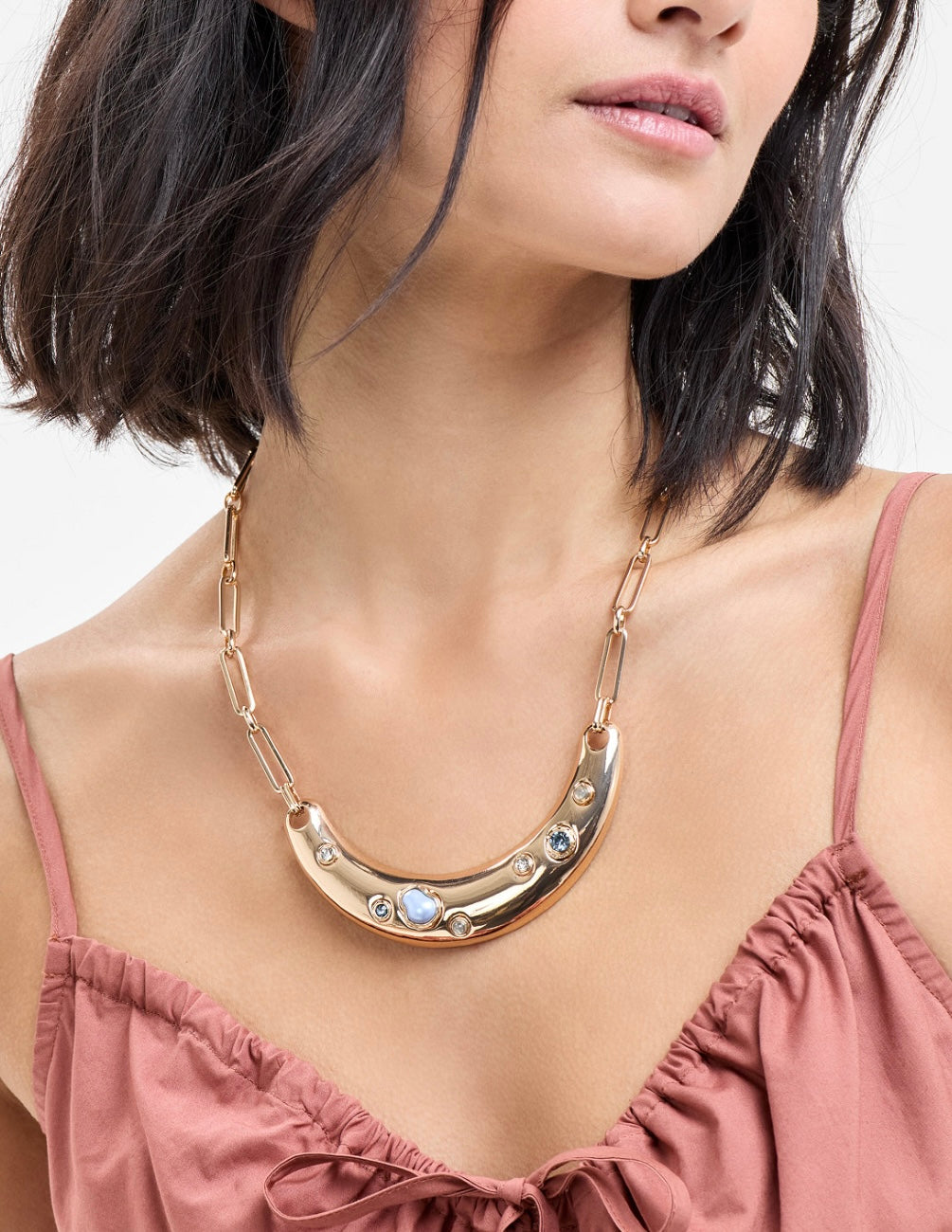 Scattered embellishment highlights the curved bar that's featured from this statement necklace.