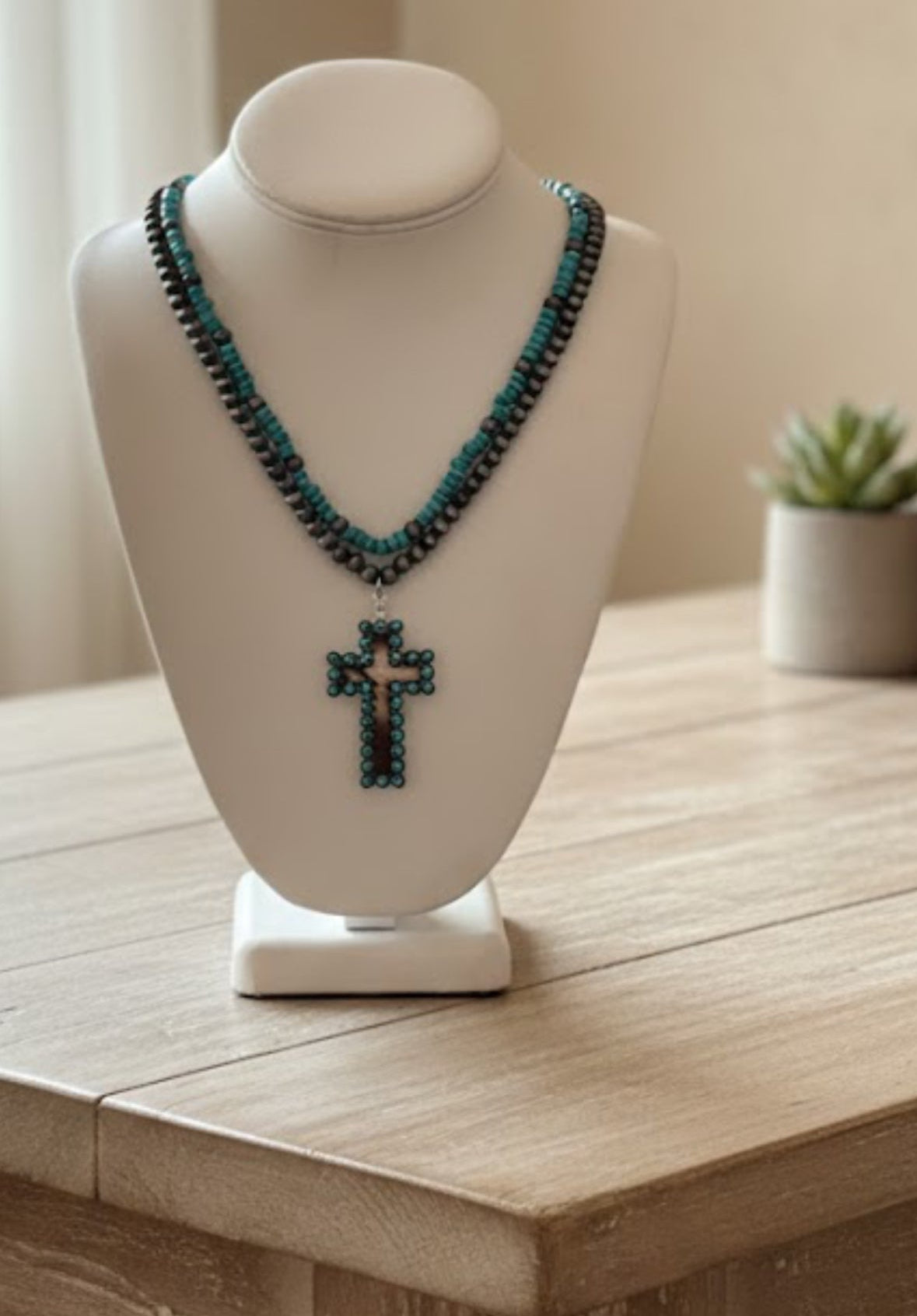 Elevate your accessory collection with this striking turquoise and brown necklace, featuring a distinctive cross pendant crafted from premium faux cowhide material. The rich color contrast and textured finish deliver a bold, contemporary look that pairs effortlessly with both casual and dressed-up ensembles. A versatile statement piece that brings Western-Chic inspired sophistication to any outfit.