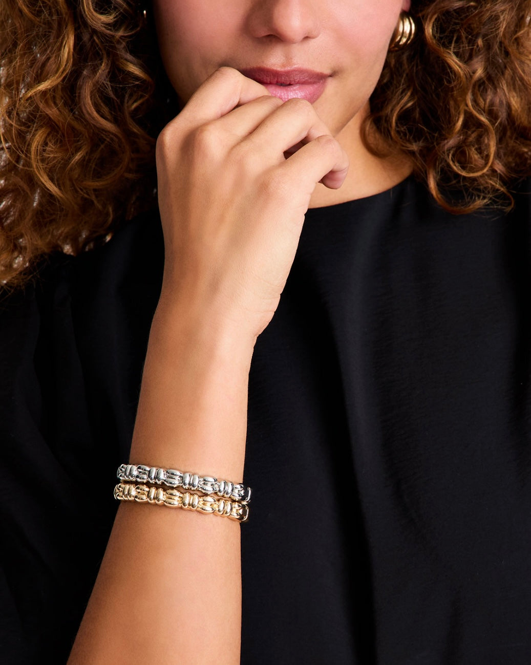 Twin textured bangle bracelets set in contrasting tones. Made for your body, your style, and your truth. As your wardrobe's best friend, these mix-and-match pieces work with everything in your closet.